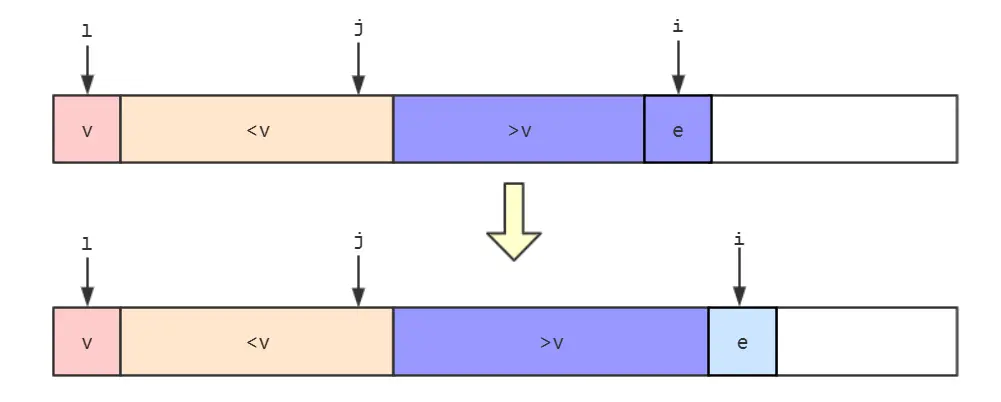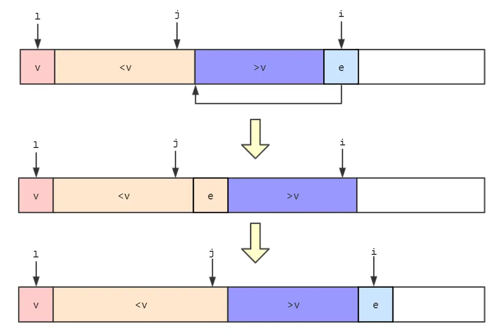 e>v,那么直接将e合并在大于v那么部分的后面,然后i++继续比较后面的元素。 -
