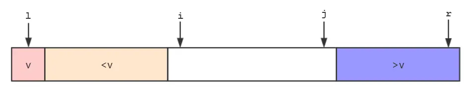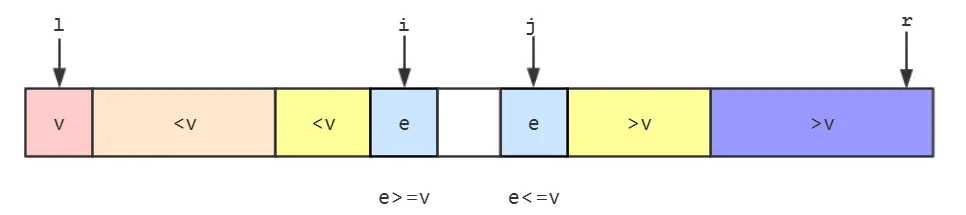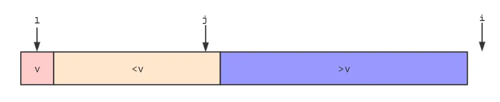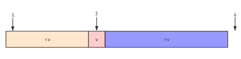 // 此时j指向的元素是数组中最后一个小于v的元素, i指向的元素是数组中第一个大于v的元素