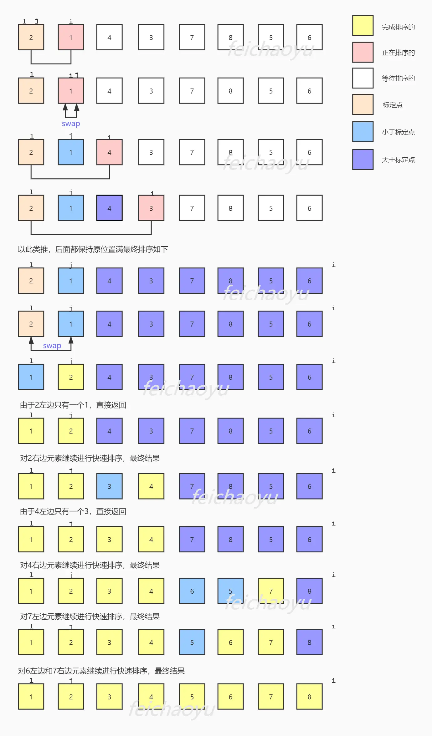 现在我们使用上述方法对数组[2, 1, 4, 3, 7, 8, 5, 6]进行快速排序,下图展示了整个快速排序的过程: