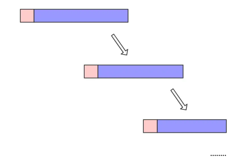 经过上述介绍,我们可以发现快速排序不能保证每次切分的子数组大小相等,因此就可能一边很小,一边很大。对于一个有序数组,快速排序的时间复杂度就变成了O(n^2),相当于树退化成了链表,下图展示了这种变化: