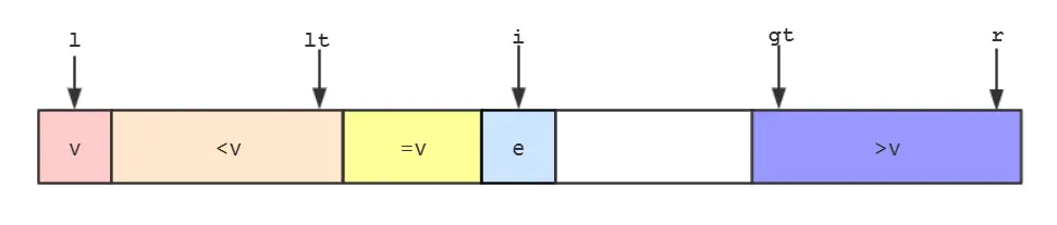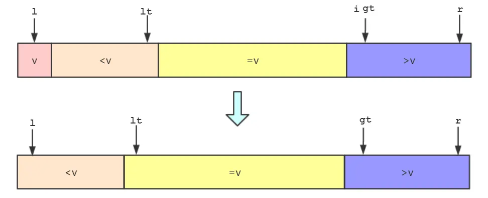 v的元素单独作为一个部分。lt指向小于v部分的最后一个元素,gt指向大于v部分的第一个元素。 -