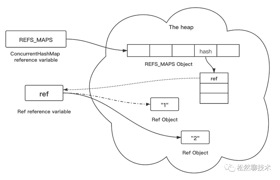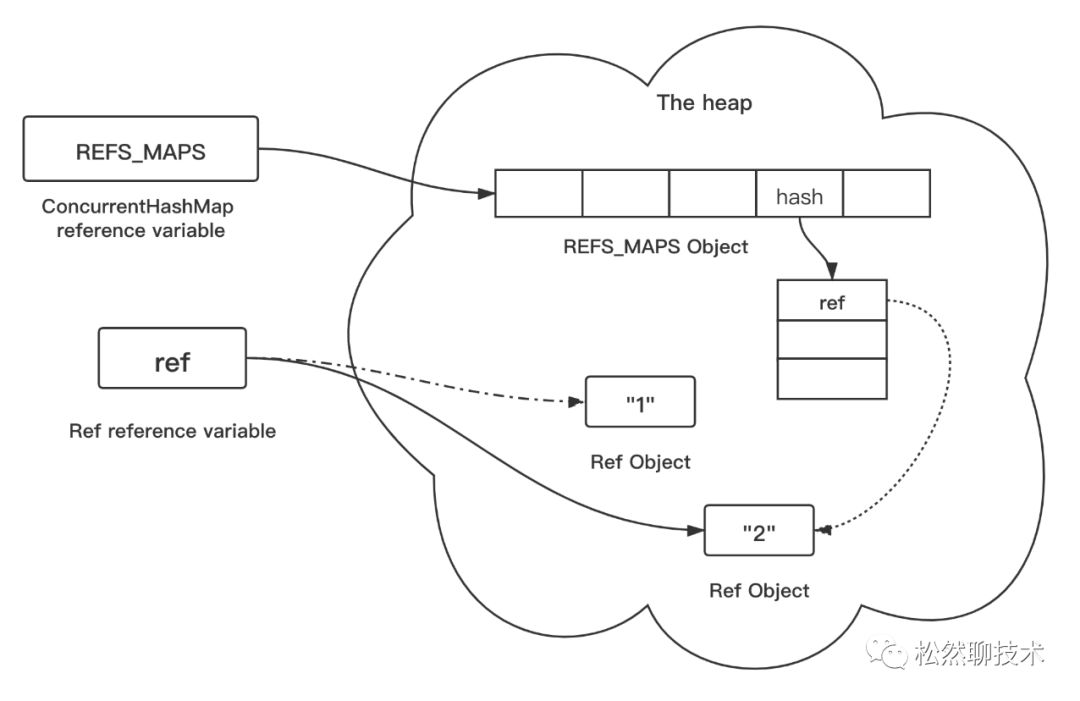 REFS_MAPS 的 hash Node 存储指向 “ref” 对象的值,而不是对象引用。因此,当 ref 在 put() 方法时,ref 的 val 先指向堆中的“1”,后指向堆中的“2”,如下所示: