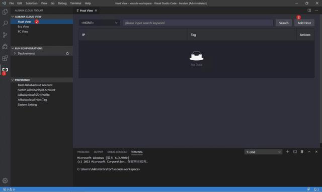 如下图所示,在 Visual Studio Code 左侧,点击阿里云图标,在出现的菜单中,点击Alibaba Cloud Toolkit - Host View打开机器视图界面。