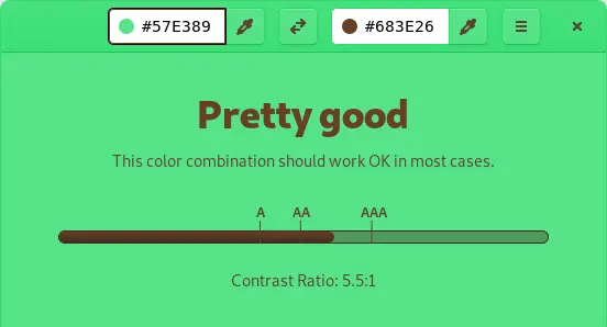 Contrast 是一款小应用,用于检查两种颜色之间的对比度并确定其是否满足 WCAG 中指定的要求。可以使用十六进制 RGB 代码或使用颜色选择器选择颜色。除了显示对比度之外,Contrast 还以选定的颜色为背景上显示短文本来显示比较。