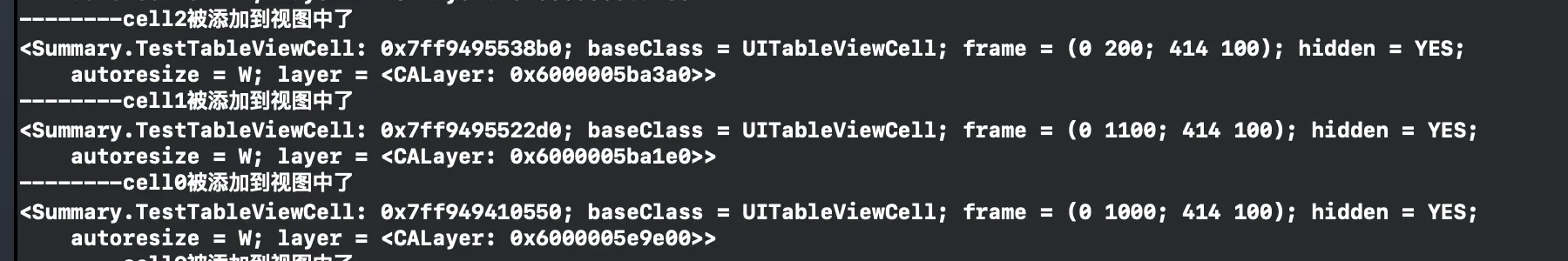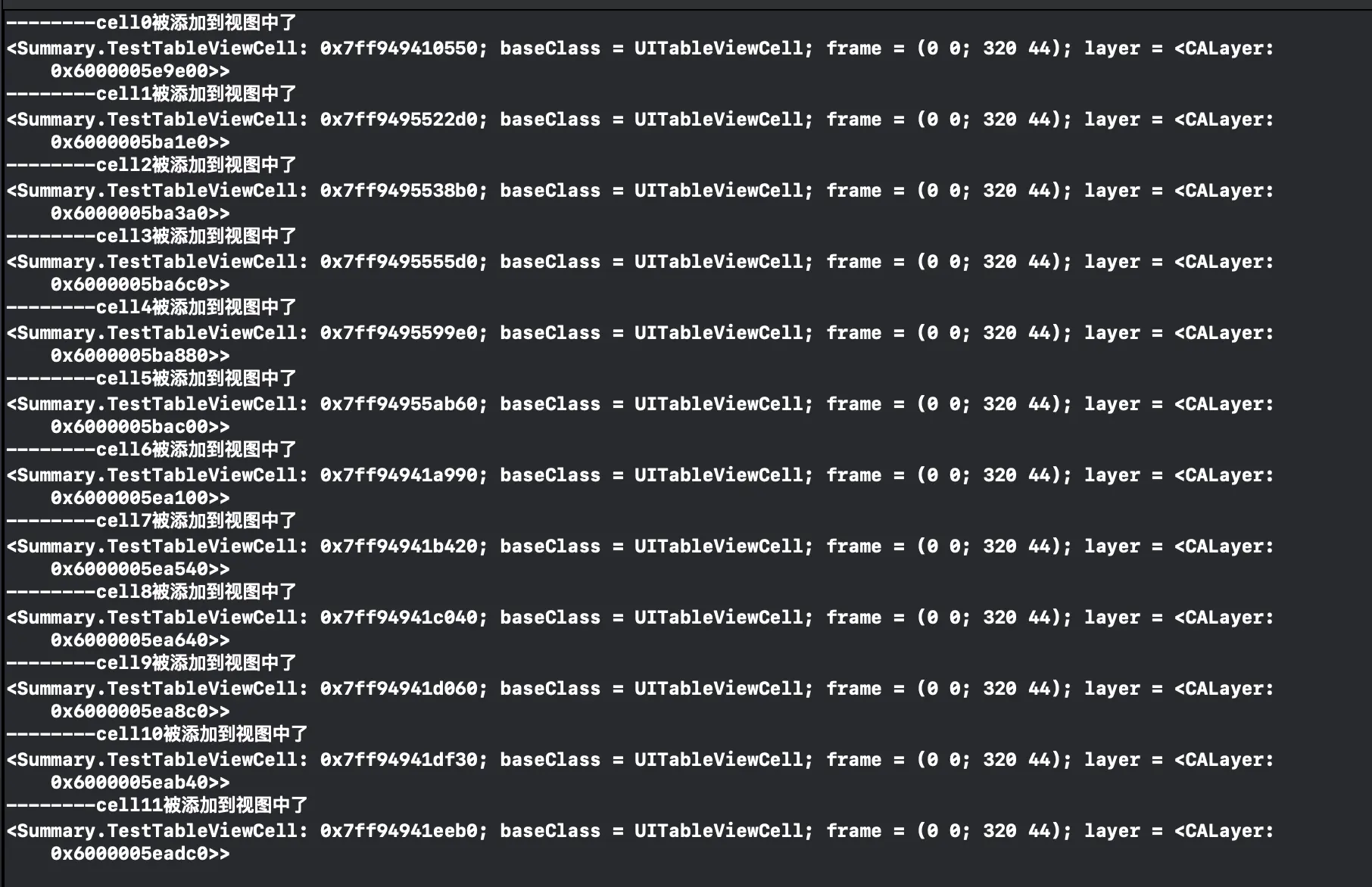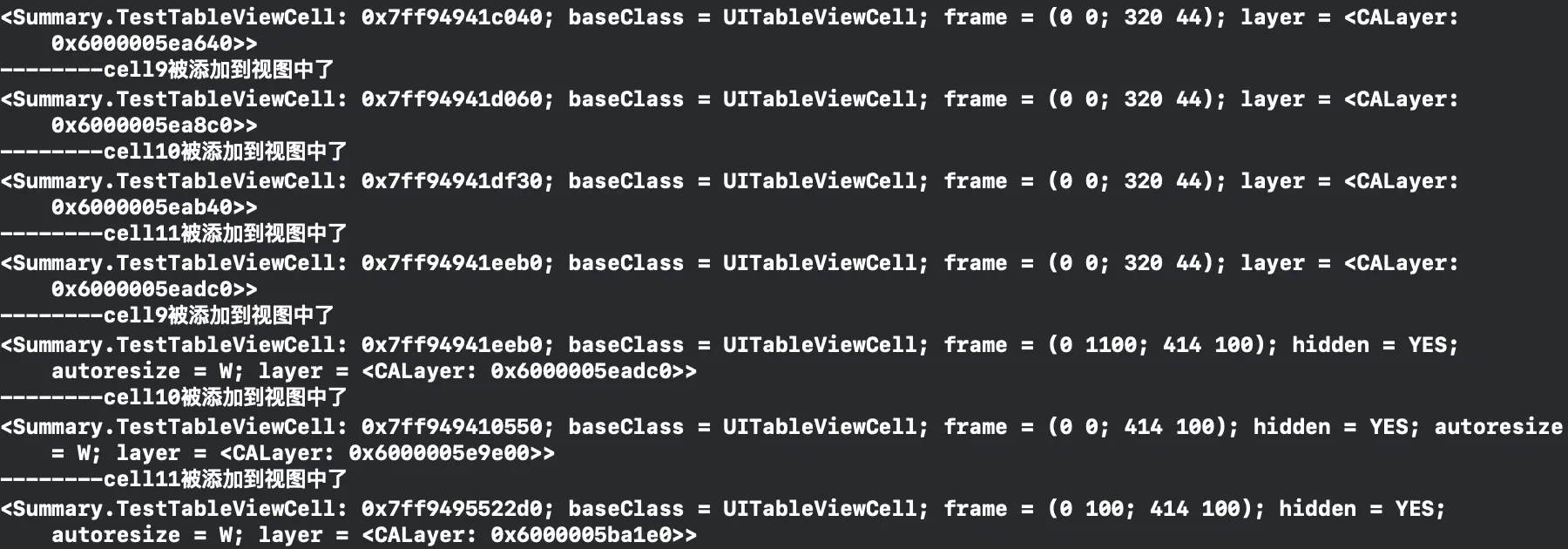 9、10、11的第一次出现是承接了上图,那么9、10、11的第二次出现便是下拉后的输出结果,可以明显的发现,这个新的9的cell是和第一次的11的地址是一样的,就可以理解为向下滑露出的第一个cell的内容是复用自最初加载的所有的cell的最后一个,因为此时最上面的cell还不一定消失,暂时不能被复用。那么新的10、11就和上图中的0、1对应,是复用自他们的,可以保证最上面的cell已经消失,不再能够被看到。