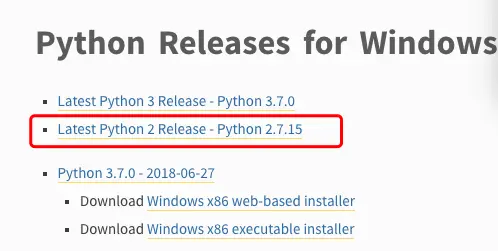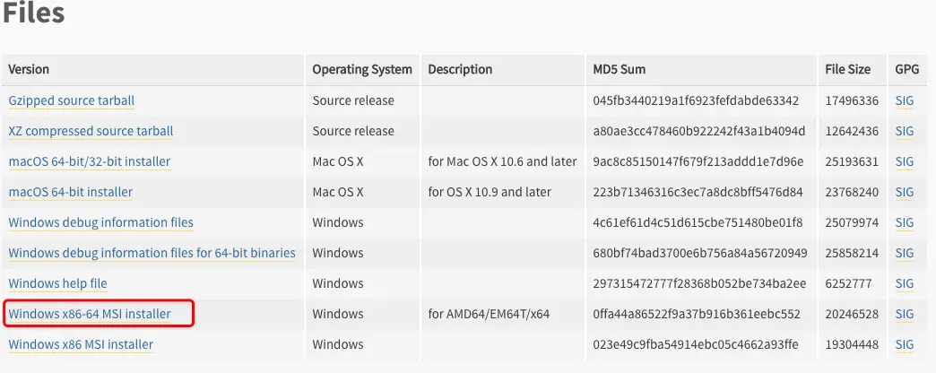 - 在下载列表中选择Window平台安装包,包格式为:python-XYZ.msi 文件 , XYZ 为你要安装的版本号。
