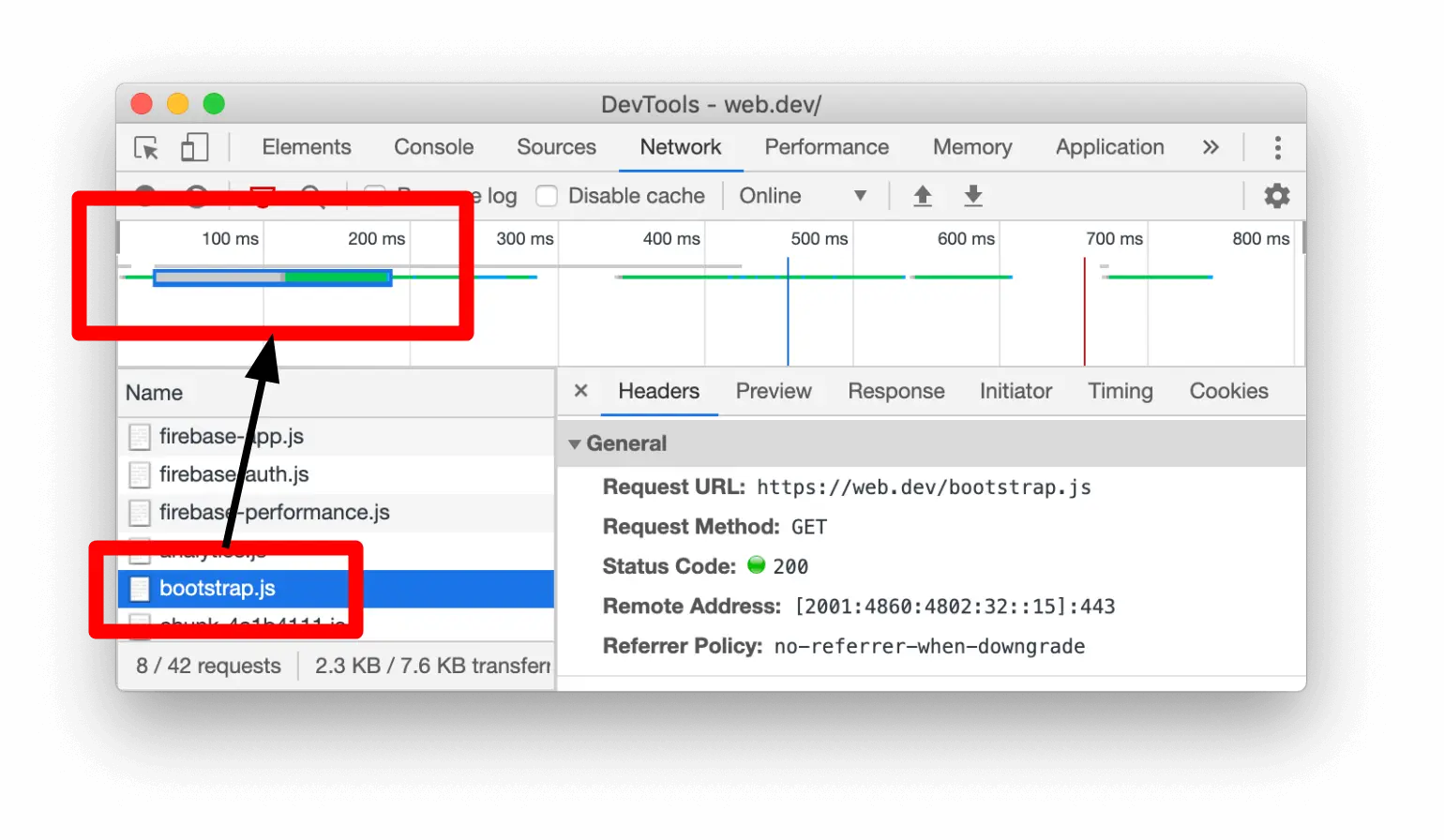 - 检查的资源是粗体。在上面的截图中,web.dev/default-627… 是被检查的资源;