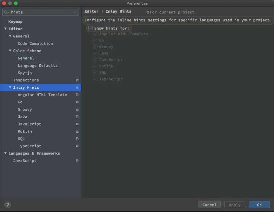 开到上图,有一个a....的东西,就是参数名称,如果你觉得不好,就可以去设置掉。在 IntellijIDEA ---> preferences ---> 搜索名称parameter hint。如下图所示