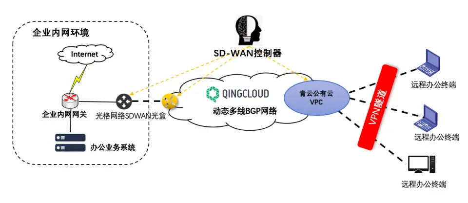 为确保特殊时期企业远程办公人员对内网业务系统安全、稳定访问,青云QingCloud 现携旗下智能广域网产品“光格网络 SD-WAN” ,以云网一体的融合能力,面向企业用户提供远程办公企业内网接入解决方案: