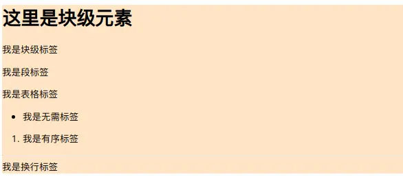 <div>、<p>、<table>、<h1~6>、<ul><li>、<ol><li>、<hr>