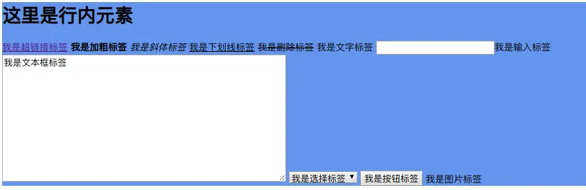 <a>、<b>、<i>、<u>、<del>、<font>、<input>、<textarea>、<select><option>、<button>、<img>