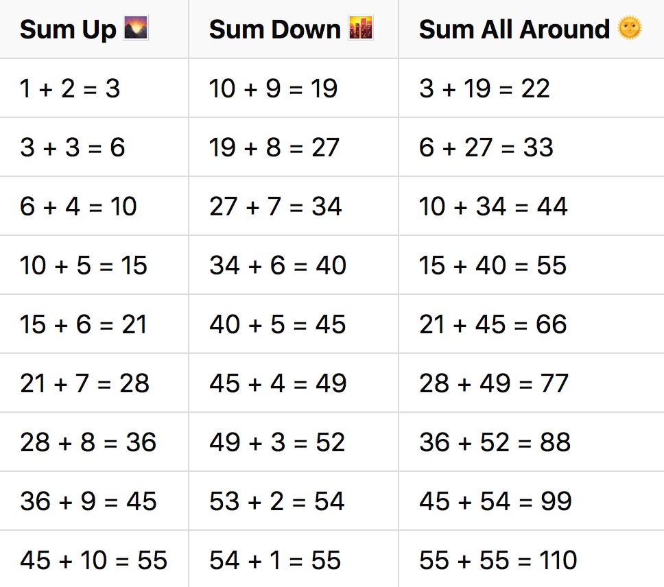 我们有五对,每对 11 求和。这些对的乘积,就是 55。