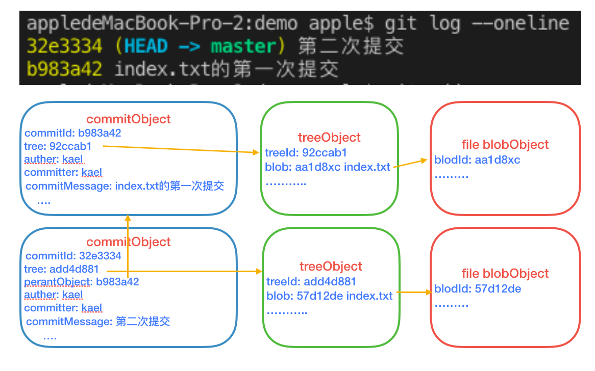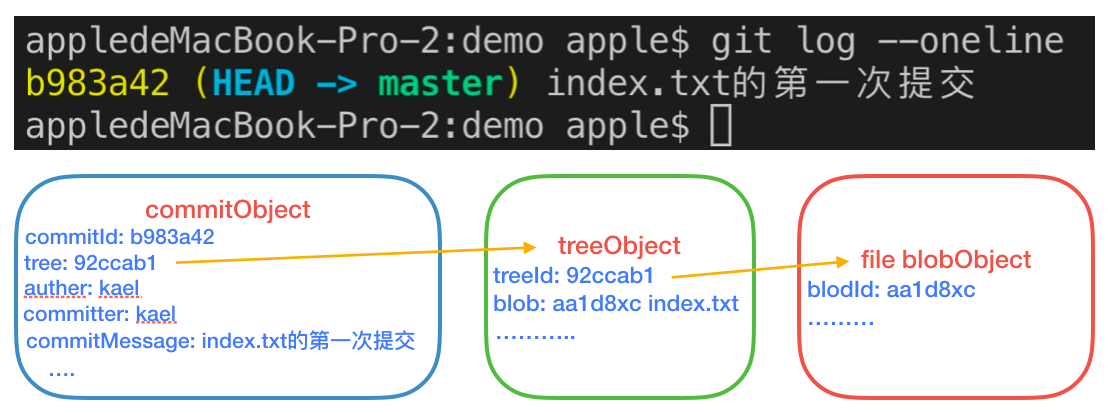 我们再执行git log,会得到一个指向commitObject的哈希值。一般多次提交之后,会得到一个哈希值的提交记录链路,这个链路就是父提交对象链路(后面再讲)。此时Git仓库里有三个对象,一个commitObject,一个tree对象,一个blob对象。