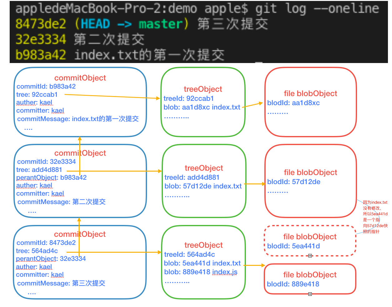 随后我做了两次提交,首先是修改了index.txt的内容。然后是新增了一个index.js文件。对图理解,log链其实就是父提交对象的链条。