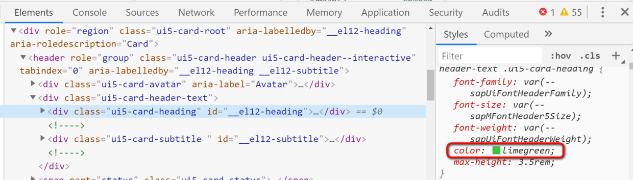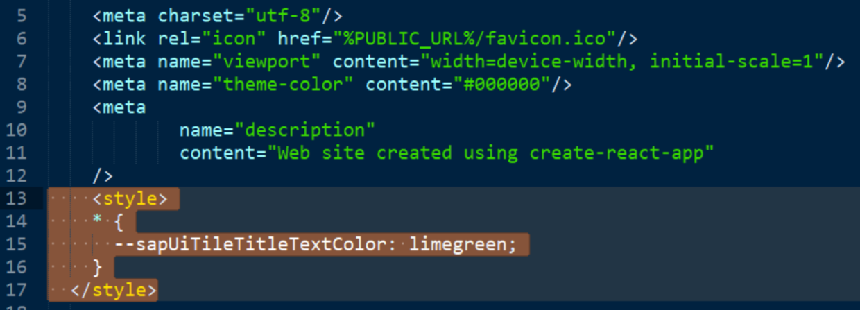 SAP UI5 Web Component里如何自定义CSS style 已注销 2020-02-12 102 阅读1分钟 没有进行样式自定义时候的应用外观: 在public文件夹的index.html里的head标签页里,添加一个style设置: <style> * { --sapUiTileTitleTextColor: limegreen; } </style> 之后的效果: 要获取更多Jerry的原创文章,请关注公众号"汪子熙":