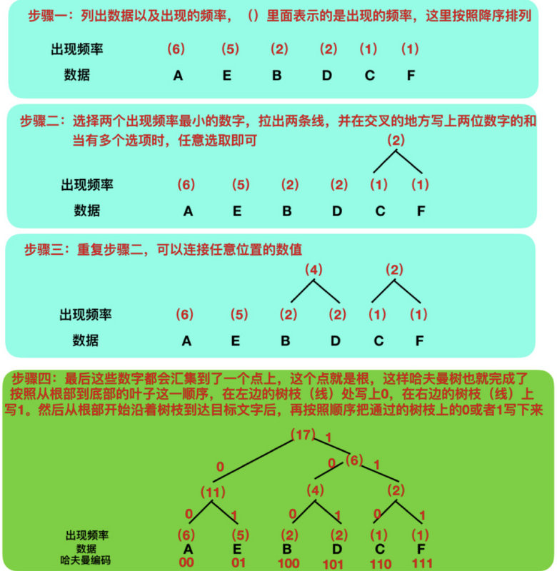 哈夫曼树的原理是:出现频率越高的字符,用尽量更少的编码来表示。按照这个原理,以数据ABBCCCDDDD为例: