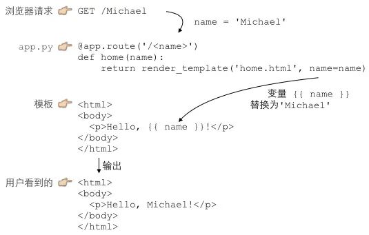 使用模板,我们需要预先准备一个HTML文档,这个HTML文档不是普通的HTML,而是嵌入了一些变量和指令,然后,根据我们传入的数据,替换后,得到最终的HTML,发送给用户: