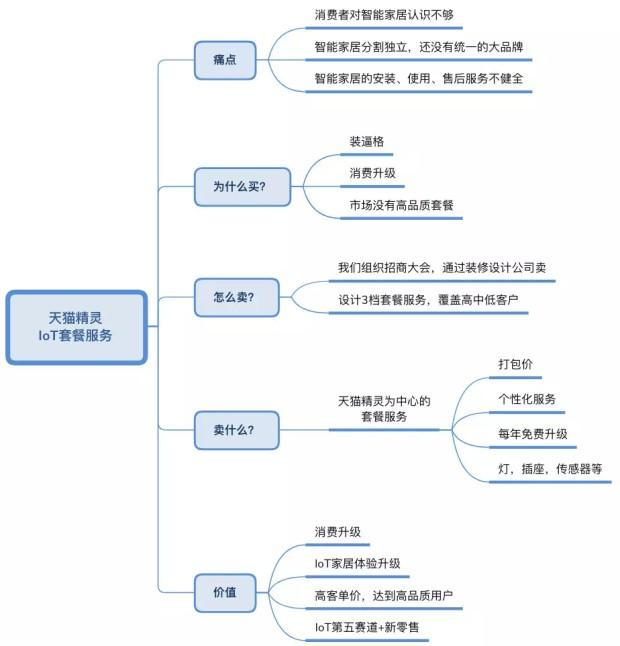 阿里巴巴的产品经理特别喜欢用 Xmind 来做脑图,从这个工作工具的频繁使用可以看出,阿里巴巴人员是喜欢做结构化思考的,也就是自顶向下或者自底向上的思考,或者 MECE ( Mutually Exclusive Collectively Exhaustive ,中文意思是“相互独立,完全穷尽”)思考。刚开始我也不习惯而且也不屑于这样思考问题,我的习惯是跳跃式思考,而且经常沾沾自喜,觉得这样的人才有创造力,后来通过 3 个月的接触,学习,阅读相关资料,我慢慢觉得脑图确实可以补充跳跃式思考的漏洞,特别是考虑问题更加全面了,这个思考方法不是否定跳跃式思维,而是重要的补充。我们做创造性工作,确实特别需要跳跃式思维,而且这个也是人类社会进步的重要思考方法,但是如果没有结构化思考能力,则人类的很多具体细节工作会丢三落四,不太容易把事情做好,做优秀。这个是我来阿里 4 个月后的体验,特别是我在做商业模式思考的时候特别有用,比如推广一个产品有 4P 原则,即 Product,Price,Place,Promotion 。分析一个具体问题可以有 4W1H 原则,即 What,Why,When,Where 以及 How ,或者 2W1H 原则:What,How 和 Why 。如果我们思考问题的时候,多多使用这种结构化思考方式,我们考虑问题会更加全面。又比如,我最近在考虑一个商业模式,就是如何推广天猫精灵智能硬件套件,我的方法就是直接打开 Xmind 工具,然后开始绘制脑图,刚开始不需要尽善尽美,先把一些跳跃式思维丢进去,然后不断从结构化思考方式丰富内容,最后出来的效果如下图所示: