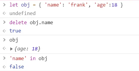 注:只能用'xxx' in obj 查看属性名是否还在对象中:true表示在,false表示不在