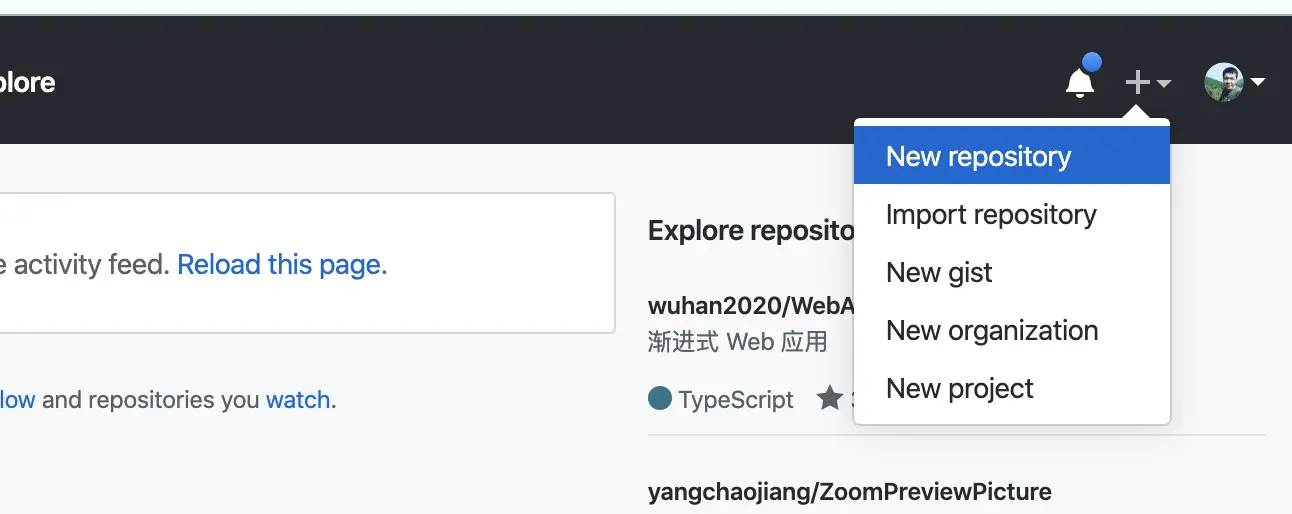 点击 GitHub 页面右上角的加号按钮,可以选择创建仓库,如下图所示: