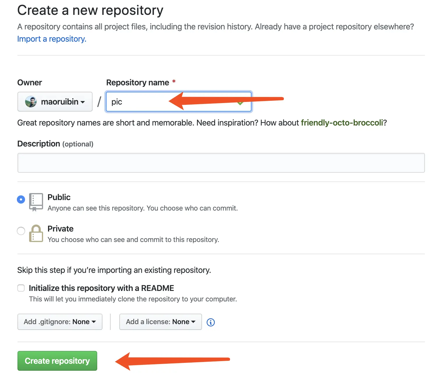 点击 New Reposity 后,接下来需要填写仓库的基本信息,这里只需要填写仓库的名称即可(记得用英文,比如 MyPic、Picture 之类的),其他的信息默认就好,不用填也不用选,然后直接点击最底下绿色的创建按钮即可。