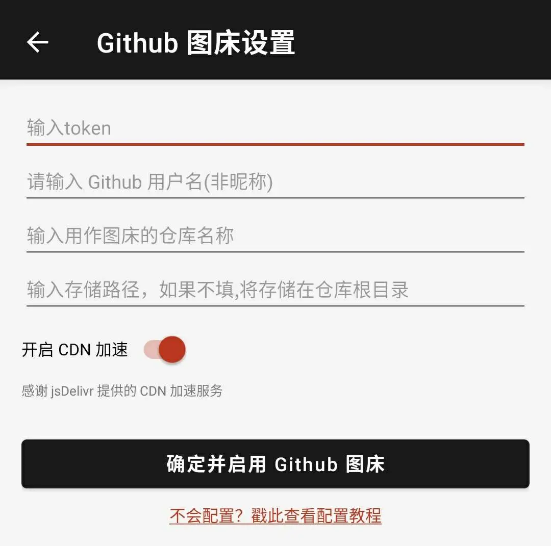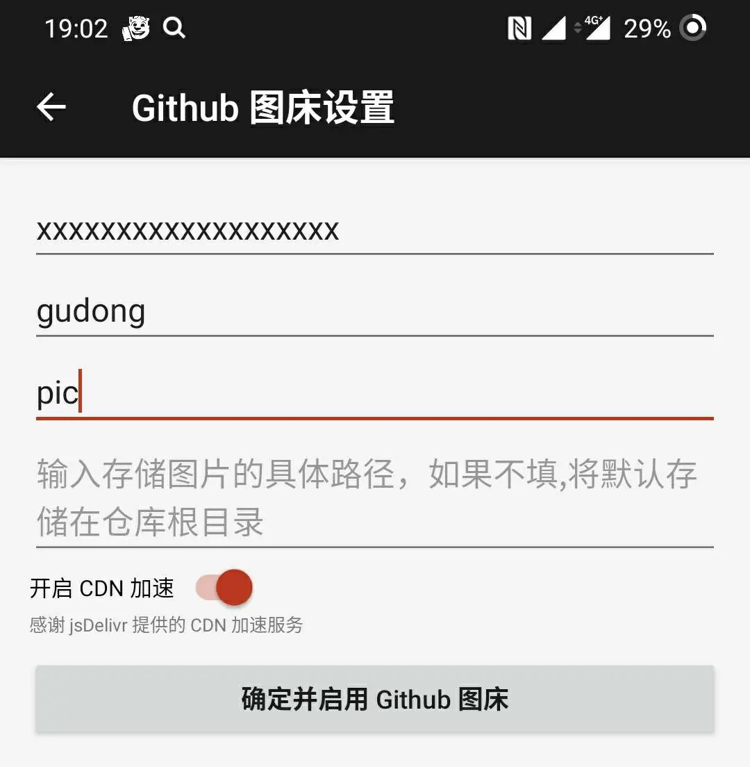 如下所示,首行需要输入 token 字符串,接着输入 github 用户名,然后输入仓库名称,按照示例分别填入 gudong 跟 pic 就 OK,如下图所示: