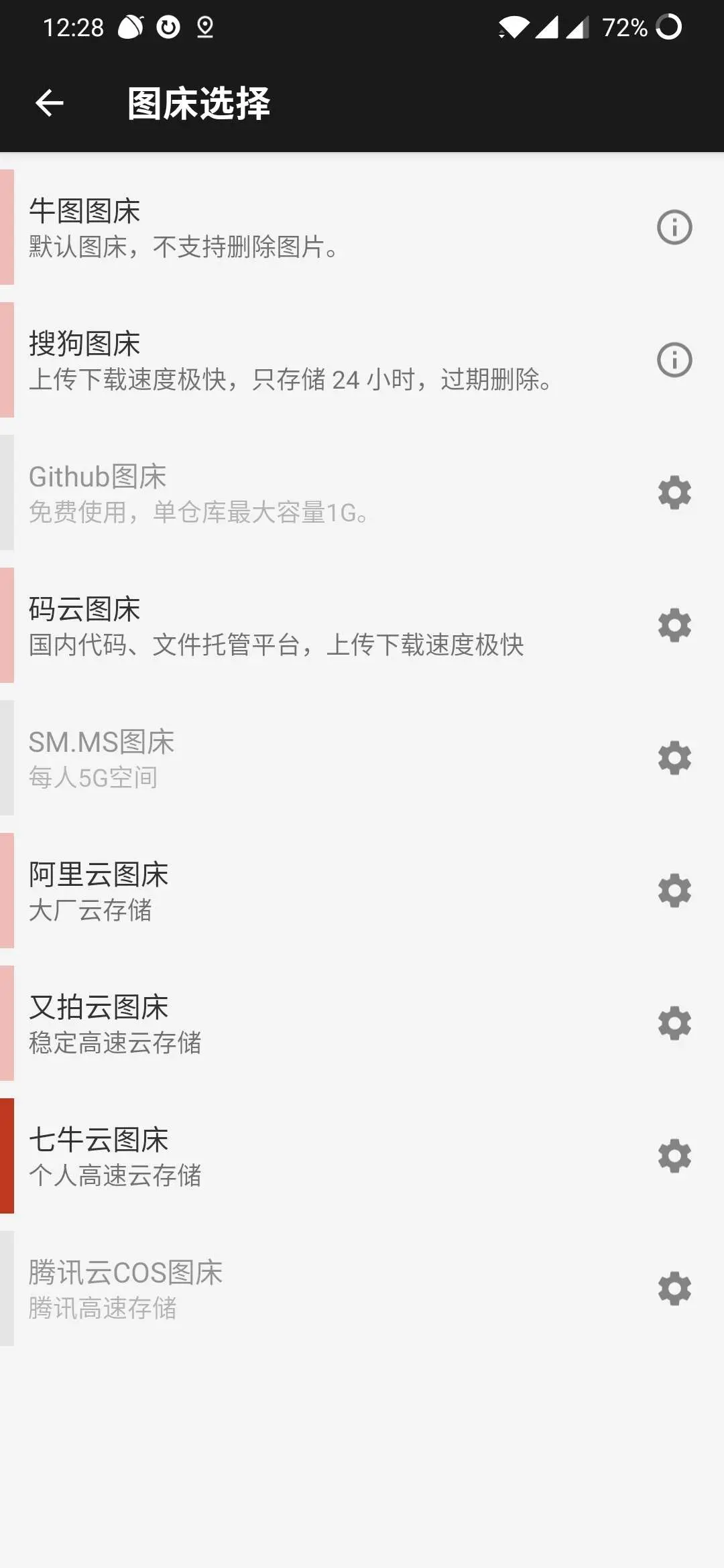 PicPlus 是一个手机端的图床上传工具,支持七牛云、aliyun、又拍云等主流图床配置,同时还支持配置 GitHub、码云作为自己的图床,如下所示: