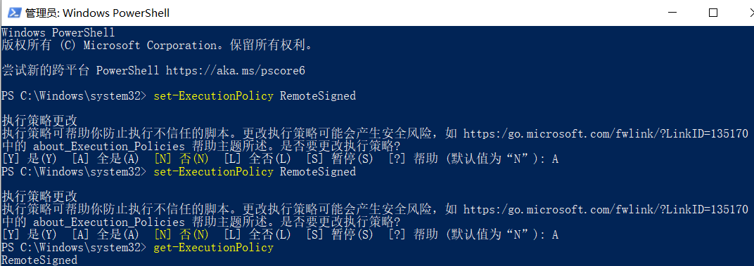 设置执行脚本的权限是 RemoteSigned , 可运行脚本,输入 A;