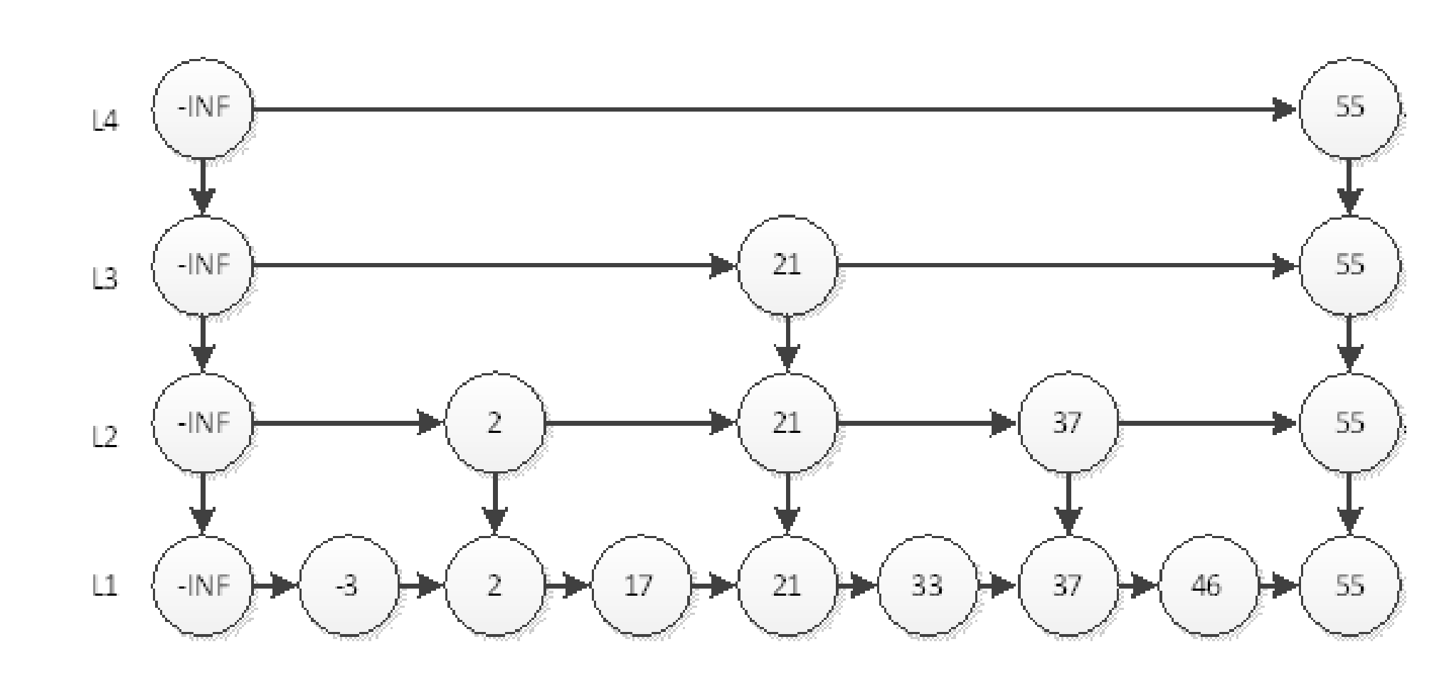 - 查询46:首先从顶层开始查55;然后查L3层21,55;然后查L2层37,55;然后查L1层46。一共查了6次。从最高层的链表节点开始,如果比当前节点要大和比当前层的下一个节点要小,那么则往下 找,也就是和当前层的下一层的节点的下一个节点进行比较,以此类推,一直找到最底层的最后一个节 点,如果找到则返回,反之则返回空。