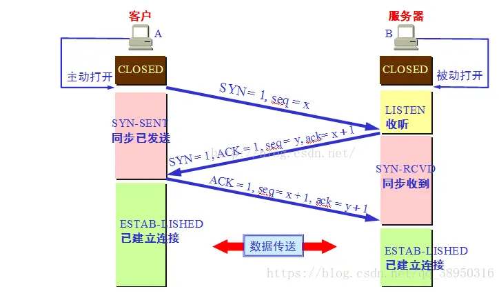 第一次握手:建立连接时,客户端发送syn包(syn=x)到服务器,并进入SYN_SENT状态,等待服务器确认;SYN:同步序列编号(Synchronize Sequence Numbers)。