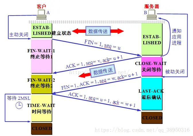 - 客户端收到服务器的连接释放报文后,必须发出确认,ACK=1,ack=w+1,而自己的序列号是seq=u+1,此时,客户端就进入了TIME-WAIT(时间等待)状态。注意此时TCP连接还没有释放,必须经过2∗∗MSL(最长报文段寿命)的时间后,当客户端撤销相应的TCB后,才进入CLOSED状态