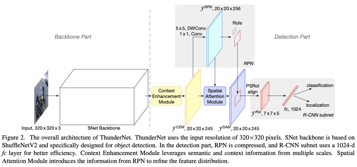 为此,论文提出TunderNet,一个超轻量级的two-stage detector。在综合考虑输入分辨率,主干网络和detection head后,整体架构如图2,主要有两部分创新: