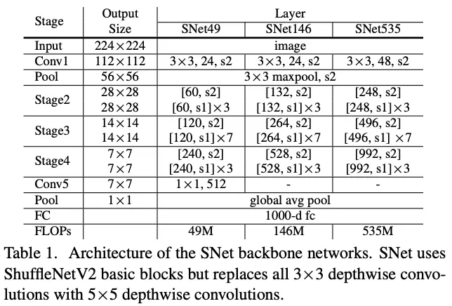 基于以上的观察,论文改造ShuffleNetV2,设计了轻量级主干网络SNet用于实时检测,共3个版本: SNet49更快速推理;SNet535更准确;SNet146是耗时和准确率的折中,结构如表1所示,主要改进如下: