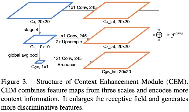 进行2x上采样和直接复制(broadcast),最后进行融合。通过利用局部和全局信息,CEM能够有效地扩大感受域和改善精简特征图的表达能力。对比FPN,CEM精算量相当小