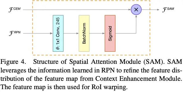 RPN能够识别目标区域,因此,RPN的中间特征能用来区分前景特征。SAM接受RPN的中间特征和来自CEM的特征