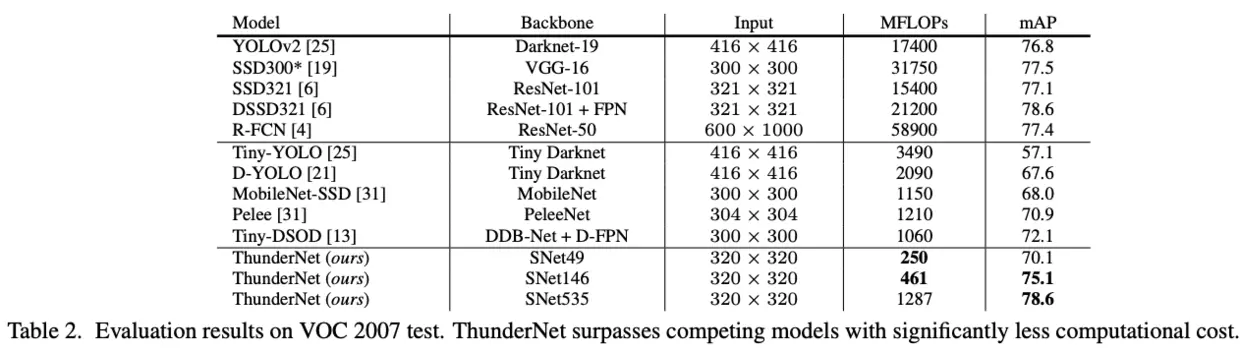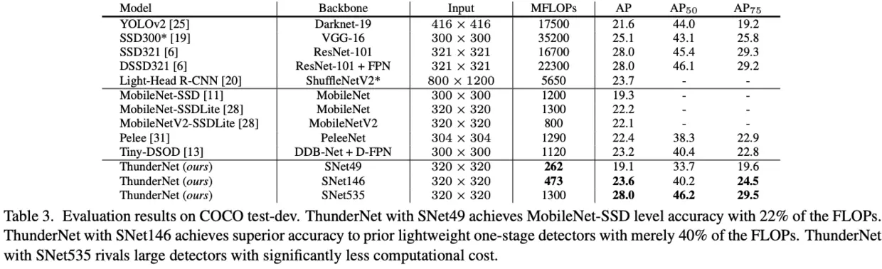 可以看到,ThunderNet能达到SOTA,而且相对于同准确率的模型,计算量降低了很多