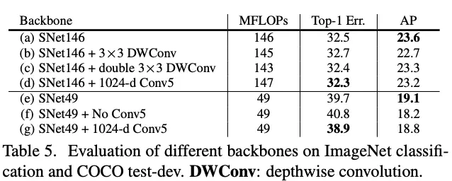 论文将SNet146和SNet49作为baselines,对主干网络的设计进行实验对比: