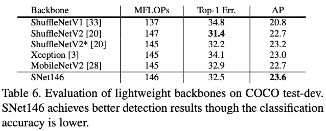 - Comparison with Lightweight Backbones,将SNet与其它轻量级主干网络进行对比,SNet检测准确率是最好的
