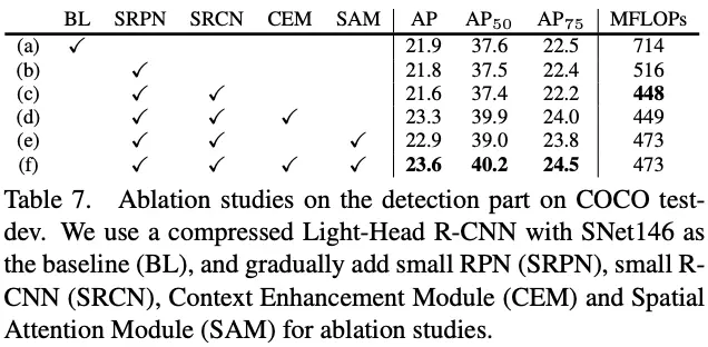 - Detection part,参考Light-Head R-CNN的设计,对RPN和R-CNN子网进一步压缩。对于小主干和小特征图产生的性能退化问题,提出两个高效的block:Context Enhancement Module(CEM),组合多尺寸的特征图来整合本地和全局上下文信息;Spatial Attention Module(SAM),使用RPN中的上下文信息来优化RoI warping的特征分布