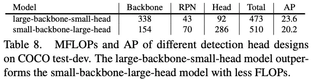 论文对比了主干网络和head的关系,large-backbone-small-head的准确率要高点,可能由于small-backbone-large-head的主干网络的特征太弱了,导致head过度设计