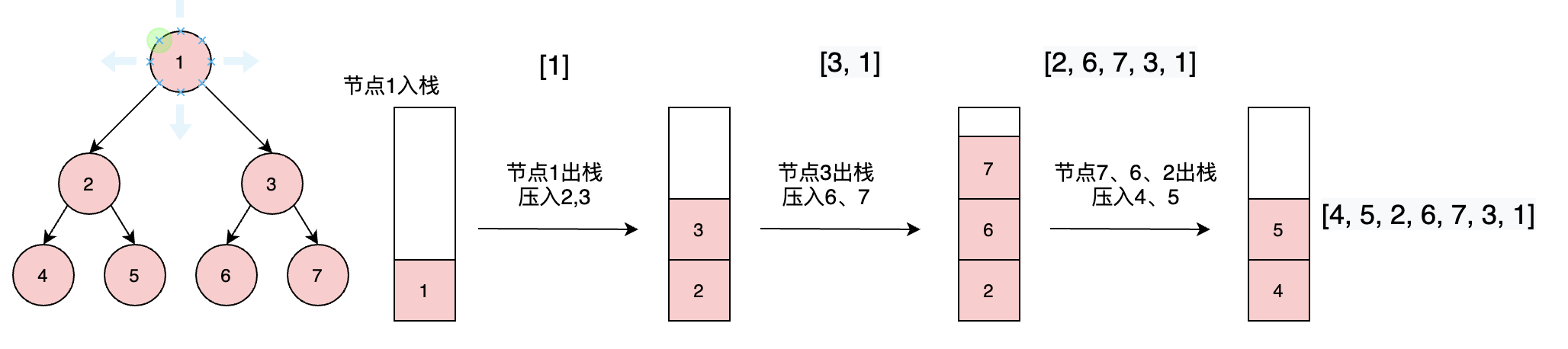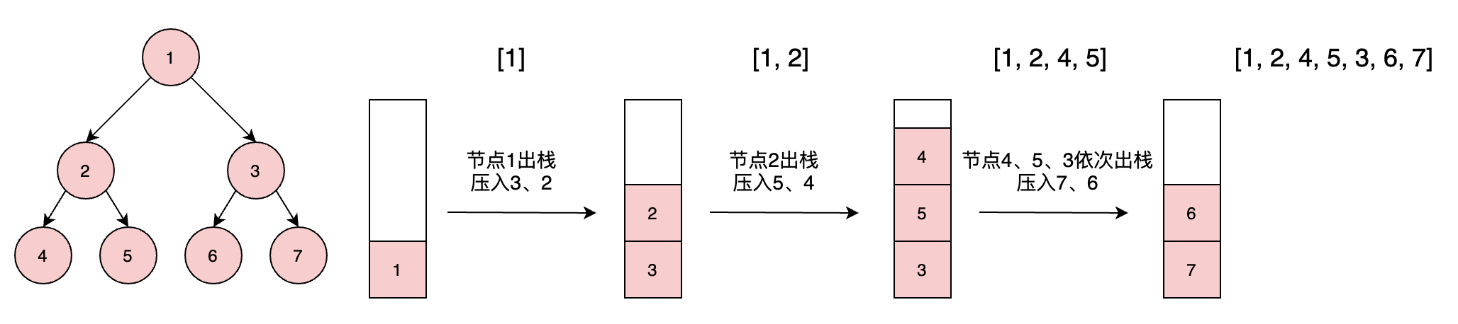 通过栈数据结构(先进后出),我们可以将父节点压入栈,对栈执行出栈操作,每次将出栈的节点的右孩子先压入栈,其次压入左孩子。这样就可以做到先遍历父节点,在遍历左孩子部分,后遍历右孩子部分。