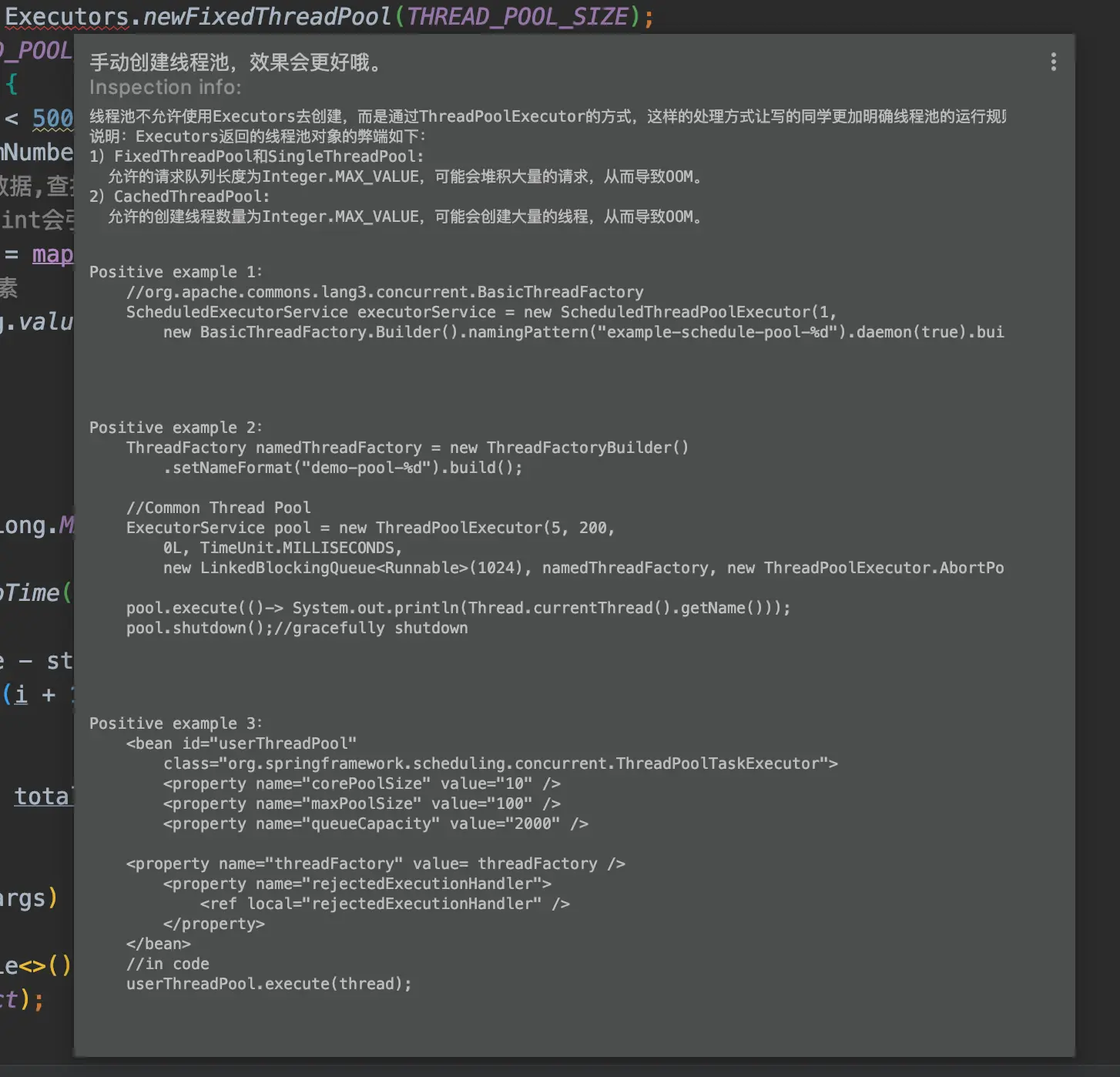 在国内的 Java 领域,阿里的影响力可谓首屈一指,其自然也成为了诸多规则抑或规约的制定者,虽然很多野生程序员不喜欢条条框框,但代码规范化总归是利大于弊的。有了这个插件,你的代码质量肯定能更上一层楼,不然各种各样的代码警告肯定会烦死你。不过有的提示确实很涨姿势,比如关于手动创建线程池的提示:
