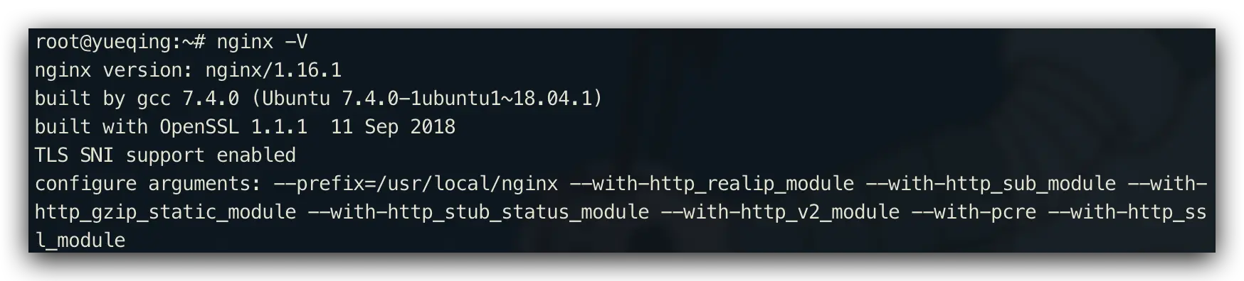 我们可以通过 nginx -V 命令来查看版本以及支持的配置。