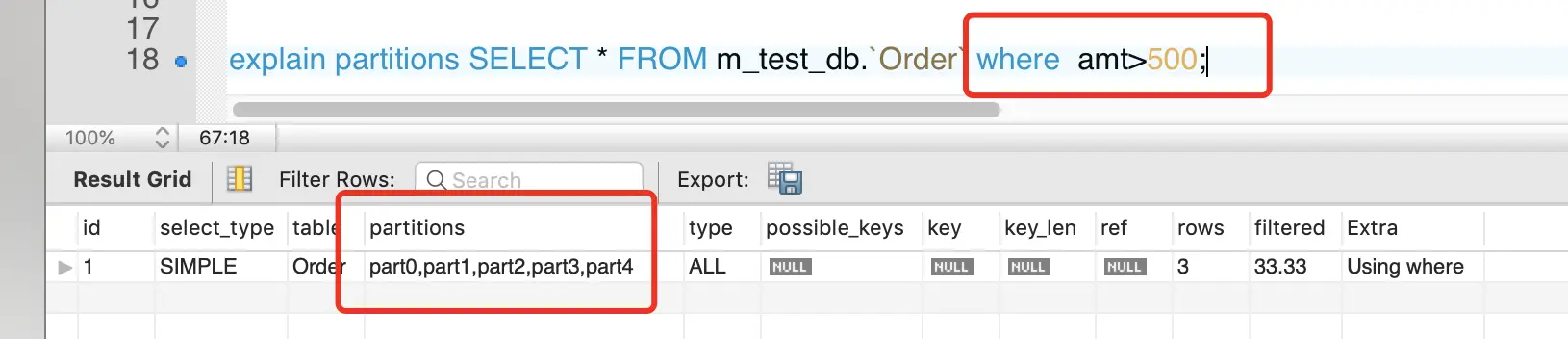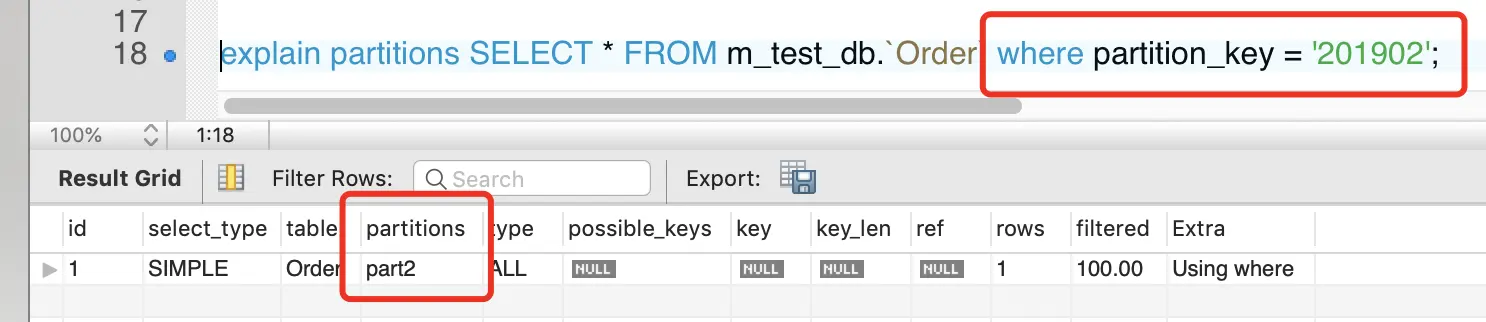 在日常开发中,如果想查看sql语句的分区查询结果可以使用explain partitions + select sql来获取,partitions标识走了哪几个分区。