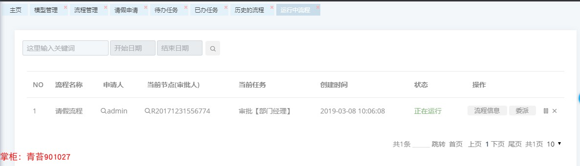 3.运行中流程:查看流程信息、当前任务节点、当前流程图、作废暂停流程、指派待办人
