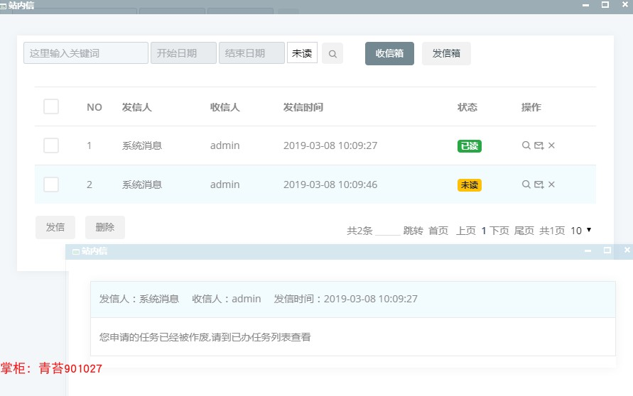 . 站内信:收信箱和发信箱,websocket技术通讯技术做的及时收信提醒,可配置语音提示来信