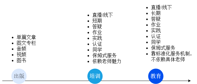 越靠近出版,自我知识和技能更迭周期越短,因为它的底层逻辑是稀缺、整理和易学性,这些东西变化很快。越靠近教育,自我知识和技能更新周期越长,因为它的底层逻辑是保姆式服务,穷尽各种方法帮助学生坚持学习,最终靠的是口碑,但是做教育是需要一个团队的,因为个人精力有限,无法支撑诸如答疑、点评、批改作业等服务。