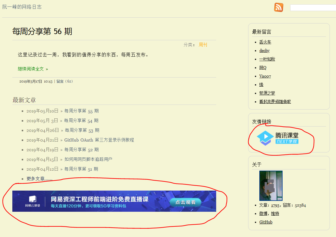 渠道模式,指的是通过托管博客、公众号、头条号、简书、知乎、独立博客等自媒体,聚集关注者,形成自己的流量池,实现流量变现。常见的流量变现方式有:接广告、卖东西(课程、电子产品、图书等等)、广告位售卖、流量主等。 举了例子 阮一峰是前端领域比较有名的 IP 了,他的独立博客——阮一峰的网络日志,访问量很大。当独立博客的 PV、UV、VV 等数据起来后,就会有一些广告主找过来买广告位(也可以自己主动去找或者加入某些广告联盟)或友情链接,就能够靠卖广告位、友情链接等方式获得被动收入了。 这是阮一峰网页的截图