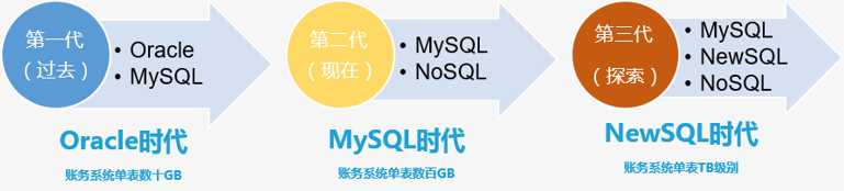 - 第三代数据库架构——核心系统以 MySQL 结合 NewSQL 为主,NewSQL、MySQL、NoSQL 并存的时代。
