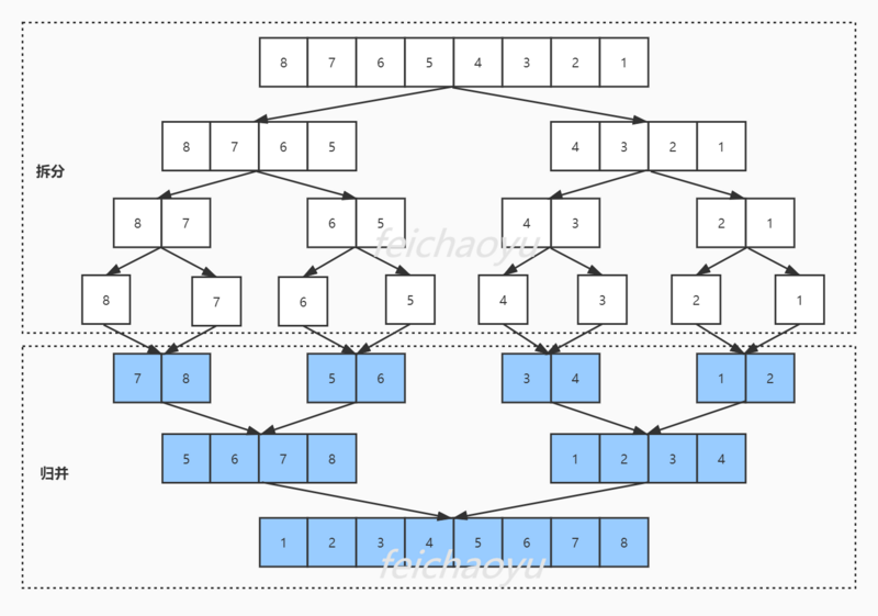 下图展示了对数组[8, 7, 6, 5, 4, 3, 2, 1]进行从小到大归并排序的过程: